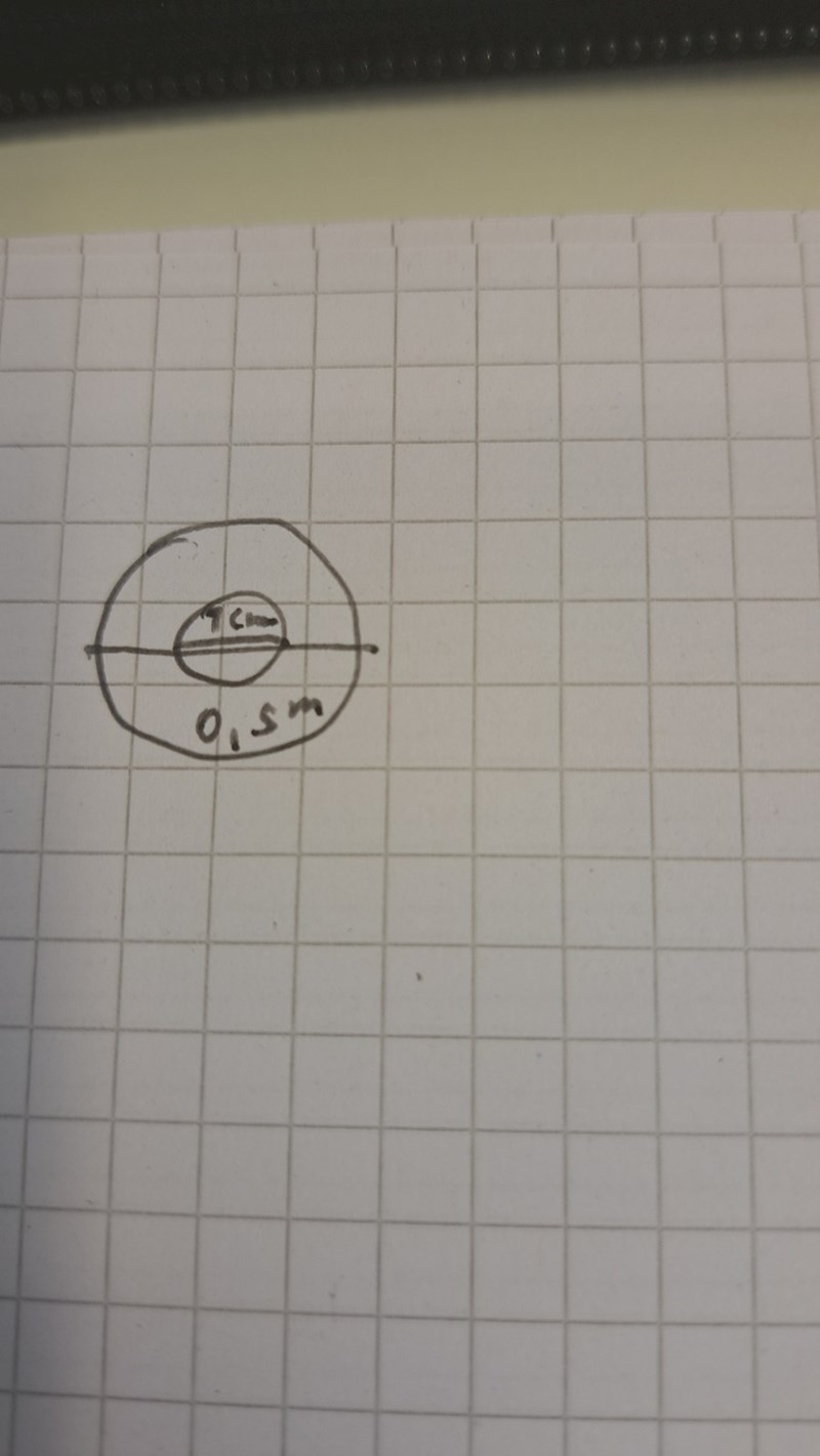 Pieter Kuiper skrev:destiny99 skrev:Jaha ok då förstår jag detta bättre nu. Så de menar ungefär såhär (se bild nedan). Den lilla cirkeln inuti den stora har diametern 1.0 cm och den stora har diametern 0.5 m.