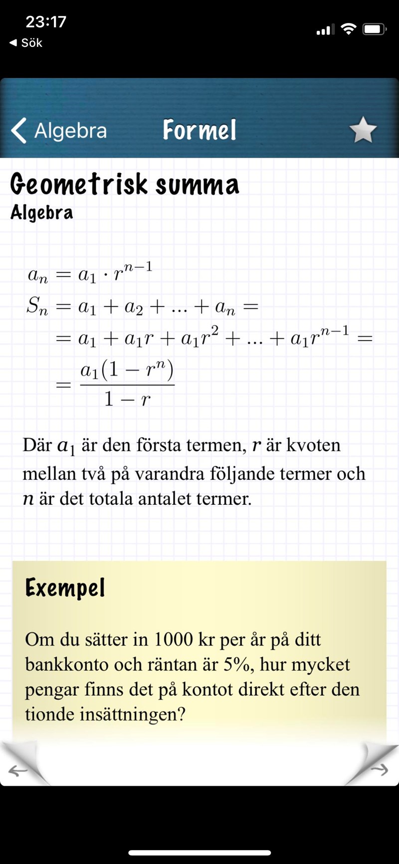 Om man skriver ut 2^3 exempelvis, så får man ju antalet barn i tredje generationen, men hur gör man om man vill veta det totala antalet barn d.v.s. 2^1 + 2^2 + 2^3? Så länge det rör sig om små summor kan man skriva ut de såhär, men om man exempelvis vill veta hur mycket barn som finns i släkten efter 17 generationer, hur går man smartast till väga då? Känns som att det bör finnas ett smidigare sätt än att sitta och skriva ut alla talen.