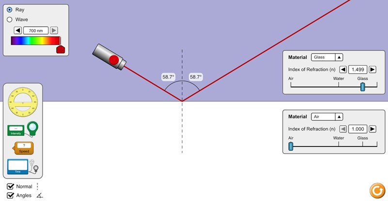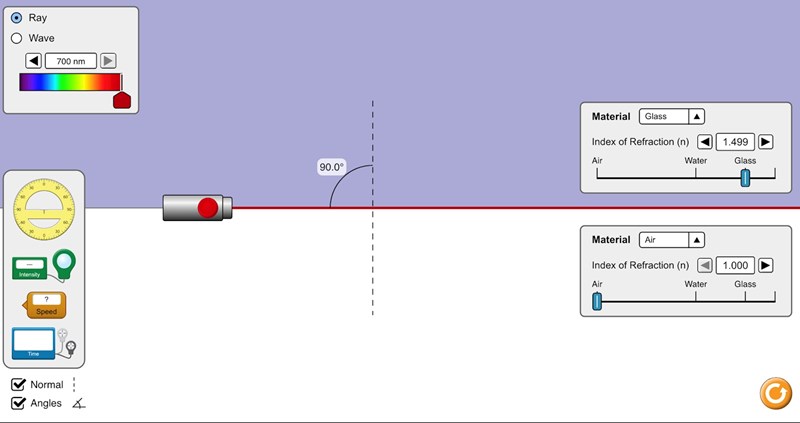 ah, vänta nu hänger jag med på vad du menar. Men ljusstrålen går inte längs med gränsytan förrän den hamnar som jag har gjort i simulatorn. Om jag skulle placera lasern sådär så blir det fortfarande en totalreflektion som u ugglans steg fyra och inte som i steg tre, som jag försöker återskapa. Lasern måste i det fallet vara i 90 grader mot normalen för att brytningsvinkeln ska bli på det viset som i ugglans steg 3.