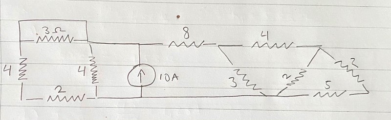 Det är en a) del och en b) del, men om 3ohm resistorn är kortsluten så är vänstra sidan 2 ohm. Då har vi 2 ohm på vänster, 10 A strömkälla i mitten och 9,95 ohm på höger sida. Ska jag räkna det som paralellt för att få Rtot?