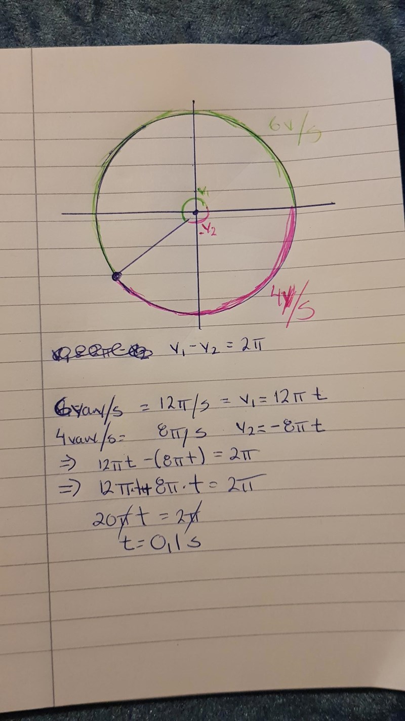 FHLa skrev:2 punktformiga kroppar rör sig längs en enhetscirkel. Avgör hur lång tid det tar innan de stöter ihop för första gången om de båda börjar i samma punkt och den ena rör sig moturs med 4varv/s och den andra medurs med 6varv/s