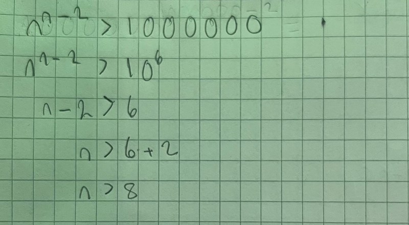 Du kan inte gå från n^(n-2)>10^6 till n-2>6.