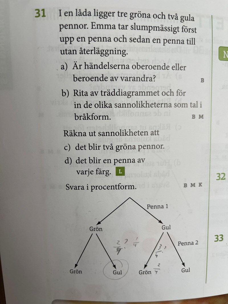 Det finns tre gröna och två gula pennor. Det första ledet (penna 1) förstår jag: grön= 2/5 och gul= 2/5