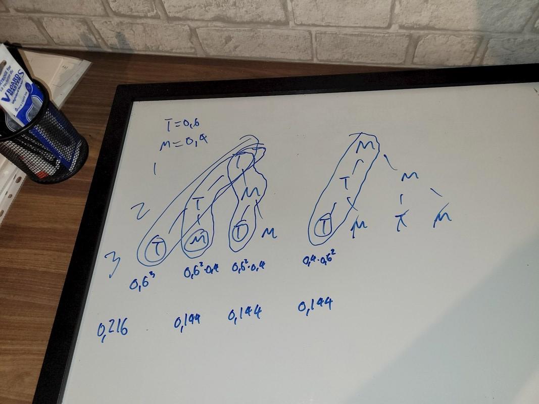 Jag glömde säga att jag adderar ihop sannolikheten för varje gren som stämmer in på önskat utfall, alltså de grenar som innehåller minst 2 stycken T.
