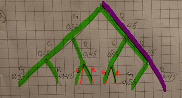 På vägen till jobbet passerar Sara tre trafikljus. Sannolikheten att ljuset visar grönt ljus 55% och rött ljus 45% på alla tre trafikljusen.
