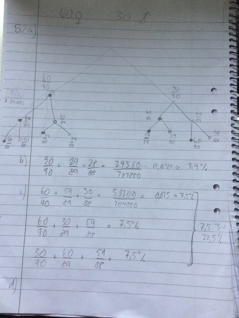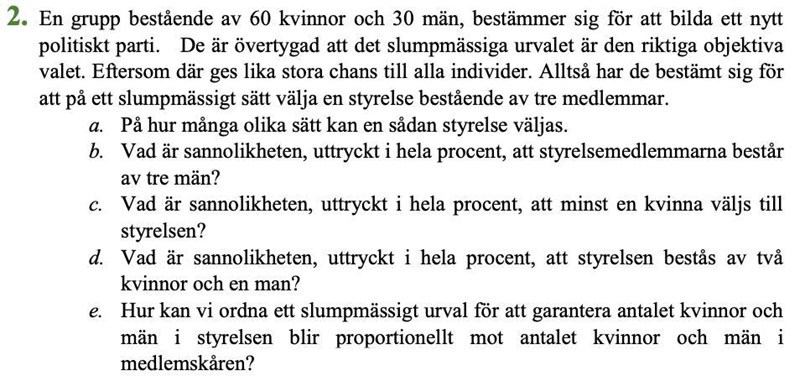 För att beräkna b. har jag fått ett utfall av enbart män som börjar med sannolikheten att första ''gången'' är en man, andra en man och tredje en man. Jag har fått således 30/90 · 29/89 · 28/88 och får svaret 3,4%. (Genom att få fram produkten av dessa bråk får jag fram att det är 3,4% chans att styrelsen består av 3 män.)