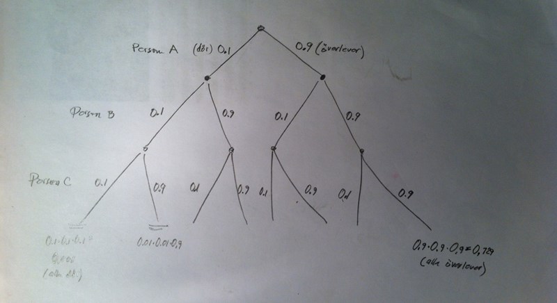Du har 8 noder i diagrammet. Vilken av dem betyder att alla tre överlever? Hur stor är sannolikheten för detta?