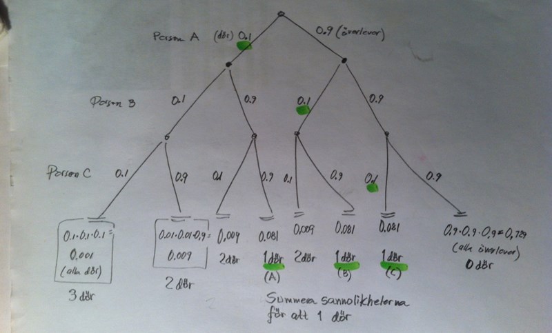 Sannolikheten att något av dessa tre scenarior inträffar (d v s att en av de tre avlider) är summan av de tre sannolikheterna.