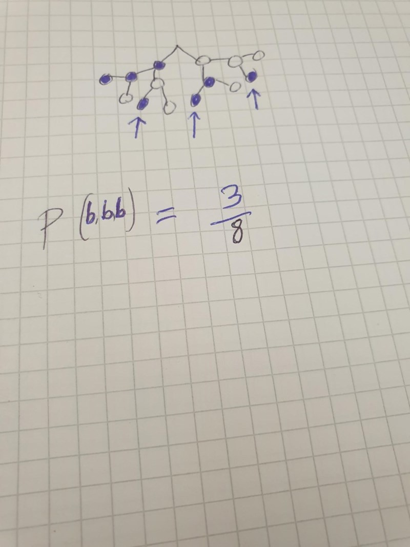 Hur många av de 8 ändpunkterna har följden blå-blå-blå? (Eftersom du har skrivit p(b,b,b) antar jag att det är detta du vill beräkna.)