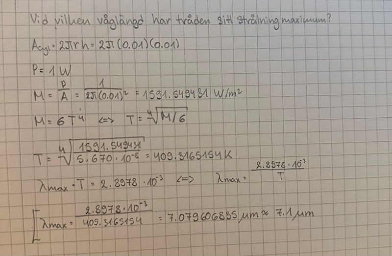En tråd har radien 1 cm och är 1 cm lång och formad som en cylinder. Tråden kan antas stråla som en absolut svart kropp. Effekten som tråden utstrålar är 1 W.