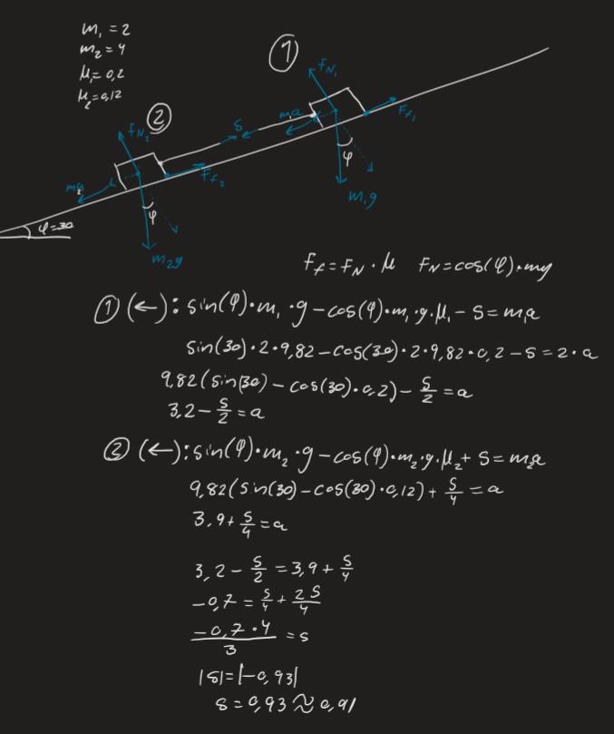 två kroppar (massorna 2 kg och 4 kg) är förenade med en tråd. Systemet läggs utefter ett strävt lutande plan (lutningsvinkeln är 30 grader). För den övre, lättare, kroppen är friktionkoefficienten 0.2 och för den undre är den 0.12. hur stor är trådkraften efter det att systemet lämnats åt sig själv?