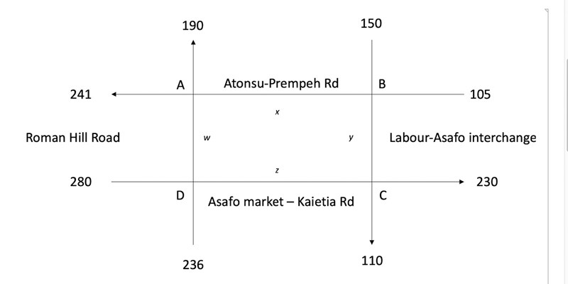 Enligt bild, ser vi nog att det kommer att bildas ett ekvationssystem med 3 okända variabler, då trafiken kan korsas i tre olika håll för varje korsning.