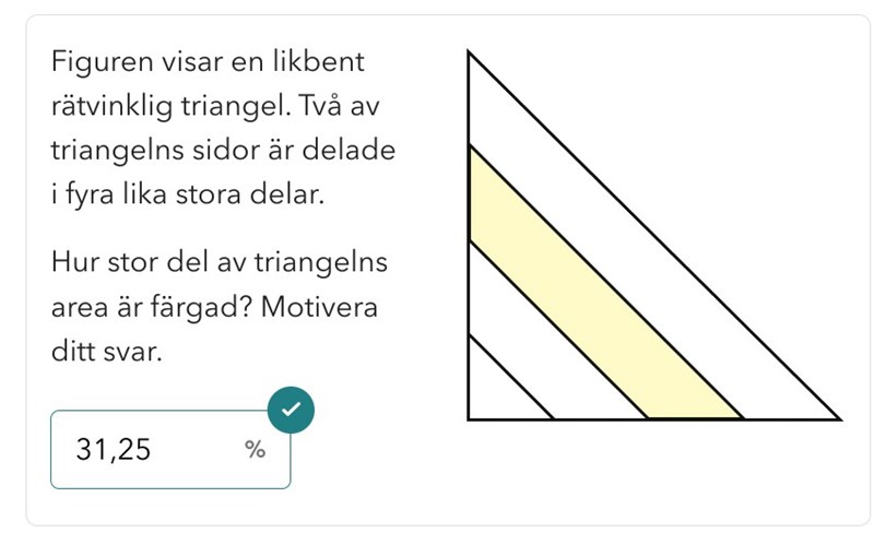 jag tänkte att hela triangeln är (4*4 )/2 = 8, alttså har den "8" areaenhet