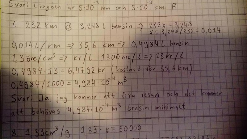 7. Du har kört en bilsträcka på 23.2 mil och bilen har då förbrukat i 3.248 liter bensin. Du har slut på bensin och behöver tanka för att åka ytterligare 35.6 km men du har endast 20 kr och bensinen kostar 1.3 öre/ cm3. Kommer du att fixa resan och i så fall hur mycket m3 bensin behövs minimalt?
