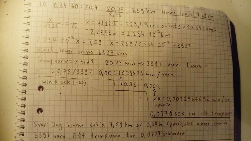 10. Du trampar cykel så att 4 trampvarv motsvarar 0.85 varv hos cykelhjulet som har en diameter på 71.12 cm. Om du cyklar med en hastighet av 2.73 min/km, hur långt hinner du cykla på 0.34 h? Hur många varv hinner cykelhjulet snurra? Hur många sekunder tar ett trampvarv?