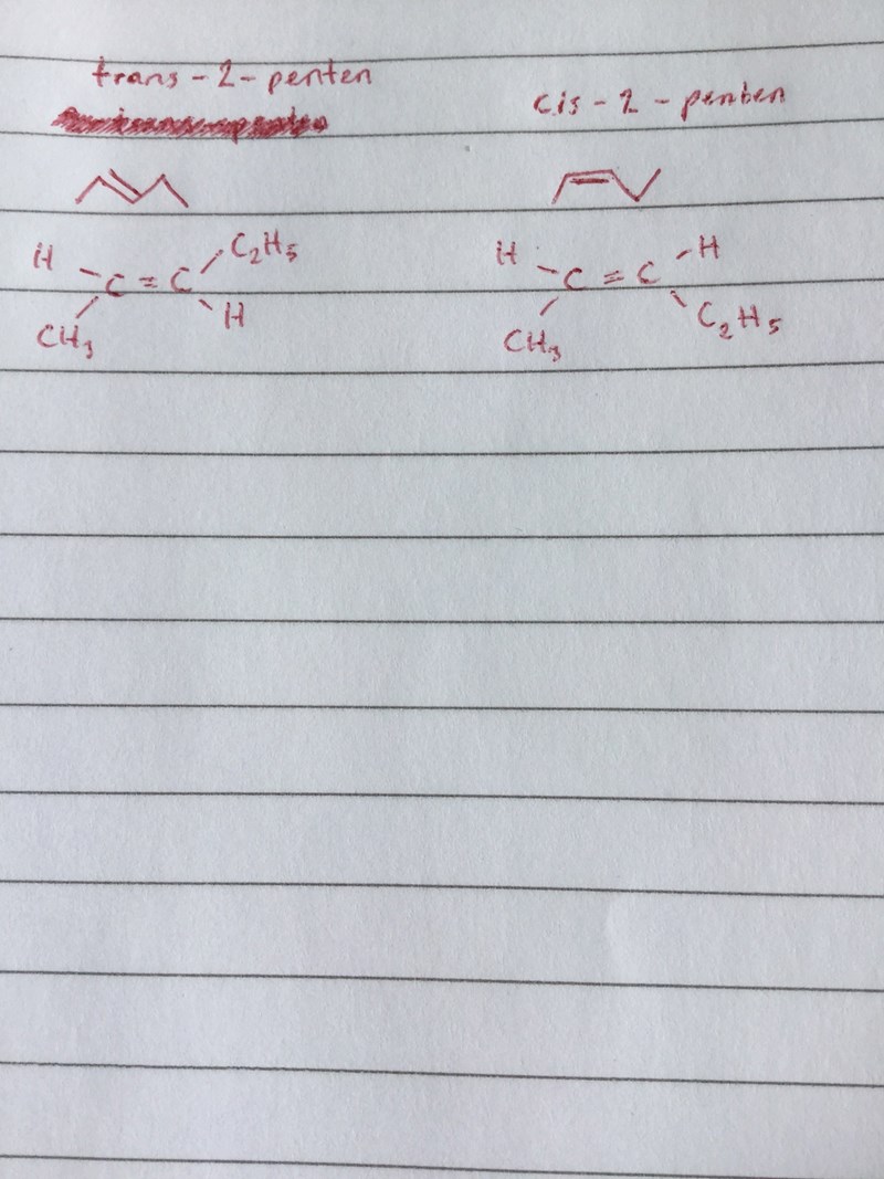 Dina exempel med 2-penten har cis/trans, just därför att atomerna/grupperna är olika (ett väte och en metylgrupp, respektive ett väte och en etylgrupp - vätena är de samma, men de andra grupperna skiljer sig åt).