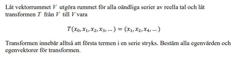 Om du reflekterar lite över det jag skrivit ovan så kan du dra slutsatsen att oavsett vad jag väljer för så kommer en vektor på formen vara en egenvektor med egenvärdet (så länge som . Om du inte tror mig, så testa transformera vektorn under .