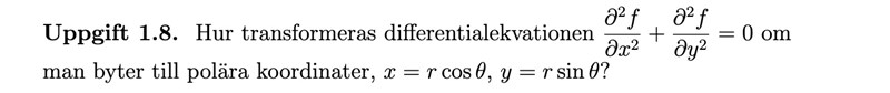 Dessa två uttryck kan nu användas för att uttrycka d2fdx2+d2fdy2\frac{d^2f}{dx^2}+\frac{d^2f}{dy^2} i termer av d2fdr2\frac{d^2f}{dr^2} och d2fdθ2\frac{d^2f}{d\theta^2}, vilket är vårt mål.