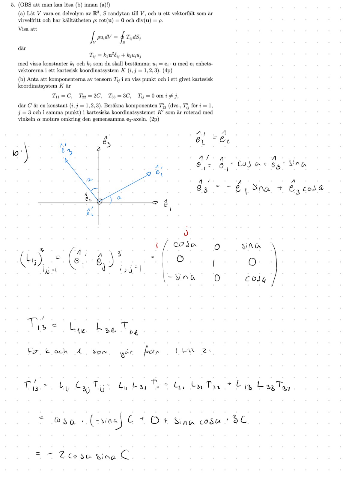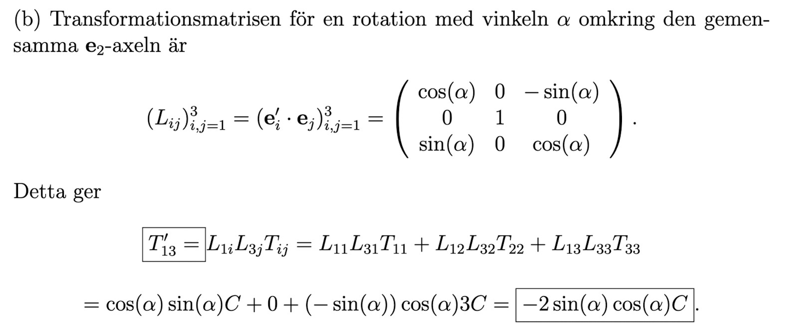 Jag missade tyvärr föreläsningen när detta gick igenom så kan ha missuppfattat hur man beräknar dessa typer av frågor. Men jag får nästintill samma svar som facit, men sina och -sina har bytt plats i transformationsmatrisen, vilket även påverkar svaret. Är det enhetsvektorerna som är fel eller något annat?
