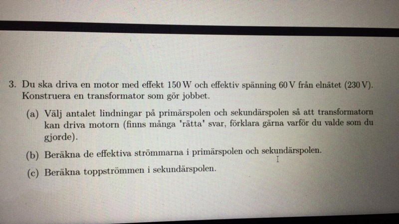 Det står i uppgiften att det finns många rätta svar. Med det menas att för en ideal trafo är bara omsättningen viktig. I verkligheten finns många andra aspekter. Jag försöker kommentera det senare ikväll. Dra till med någonting så att du kommer vidare, tex 50 sekundär varv. Det viktiga för uppgiften är att Du beräknar rätt omsättning