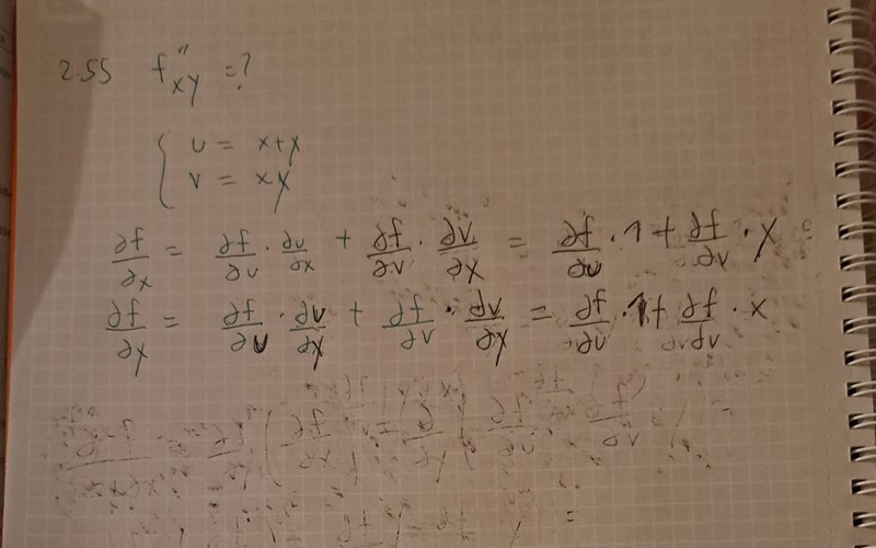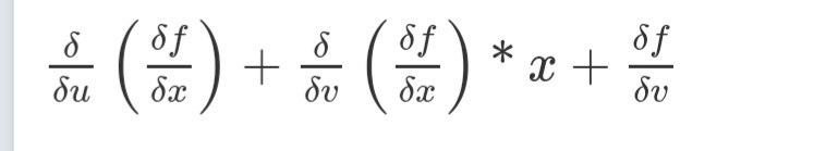 Derivatan med avseende på u på funktionen [derivatan av f med avseende på v] kan vi inte göra något med, det är bara att konstatera att det är två gånger deriverat med avseende på två olika variabler, precis som att , så vi får .