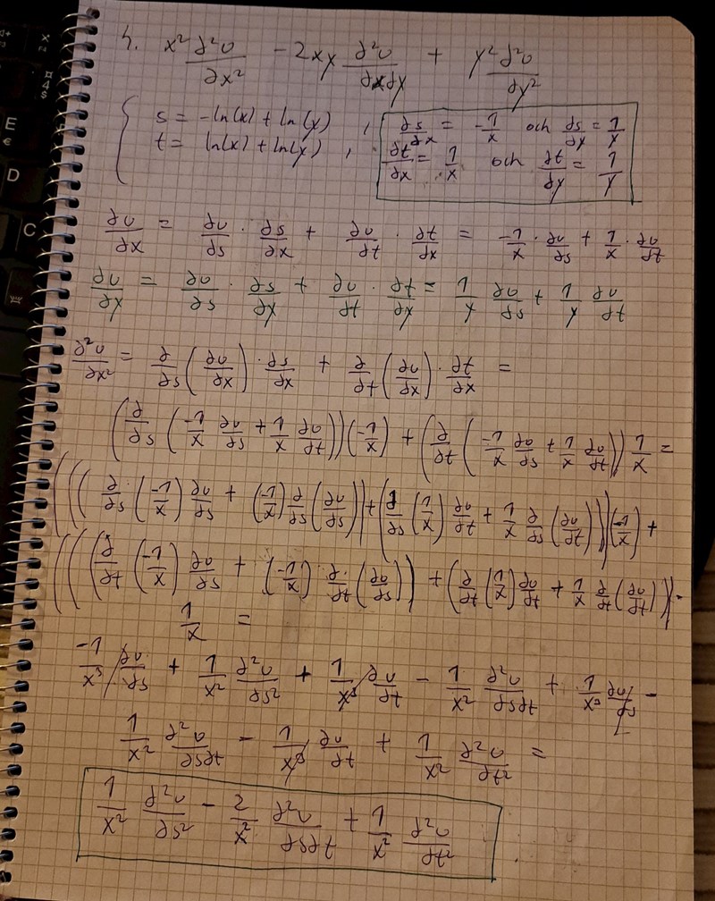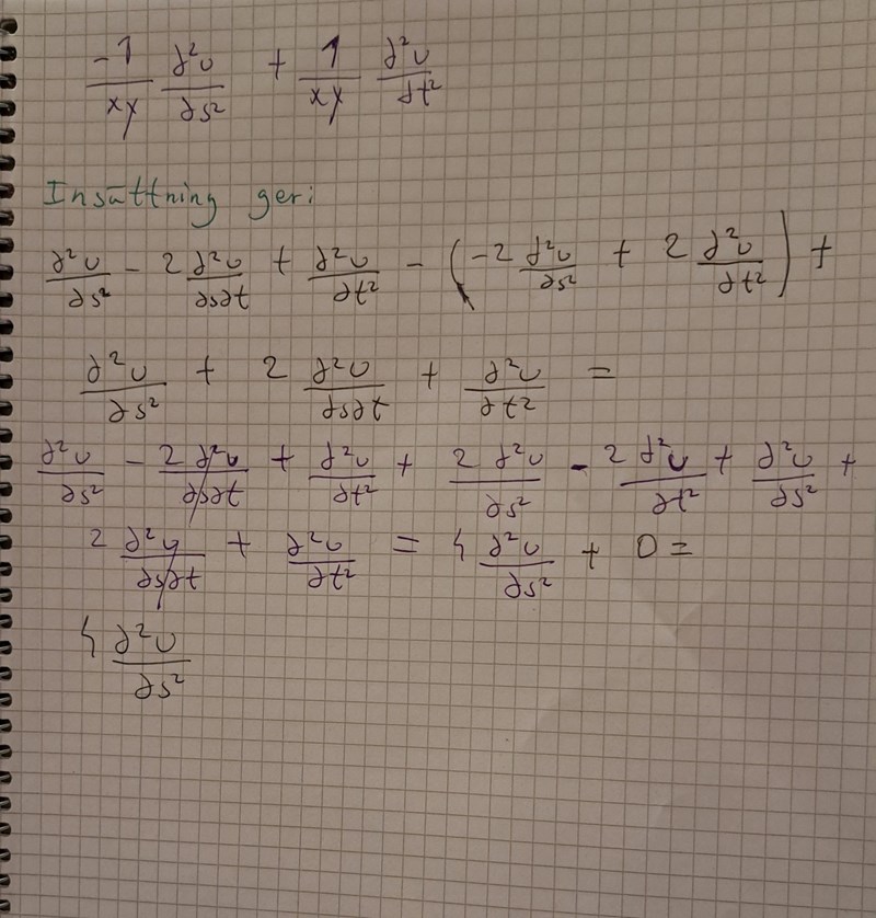 Vad hände med derivatan av 1/x med avseende på s (resp. med avseende på t)? En sådan faktor förekommer på flera ställen i andra ordningens derivator, men jag ser inte någonstans vad det blivit.