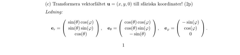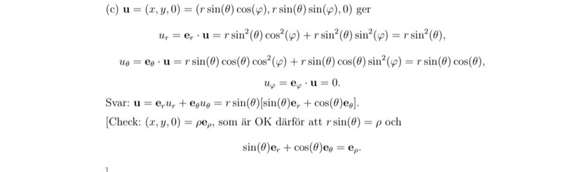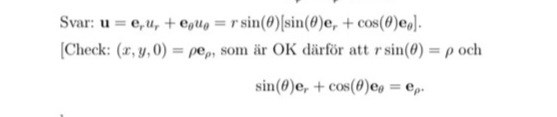 Så om man fått korrekt på vad u_r och u_theta blir som de fått. Hur ska jag komma fram till att u kan skrivas som u_re_r+u_thetae_theta som de gjort? Jag är familjär med u_r=u*e_r osv för det var så jag hittade komponenterna uttryckta i sfäriska basen och vi vet att u=(u_r,u_theta , u_phi) i sfäriska koordinater och i kartesiska koordinater blir det ju u=(ux,uy, uz).