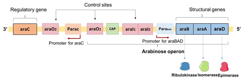 Hur kan transkriptionen ske åt olika håll i en DNA-sträng? I bilden ovanför (arabinos-operon hos E. coli), ser det ju ut som att transkriptionen för AraC sker åt ena hållet eftersom (araC ligger på andra sidan av sin promotor), medan transkriptionen för AraBAD sker åt andra hållet. Den ena änden är väl 5' och den andra 3', hur kan det då ske åt olika håll?
