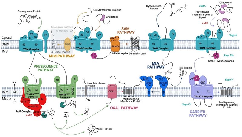 Ja det är en del av svaret, men det är inte bara att "binda ett veckat protein och transportera in det", utan ofta träs en polypeptidkedja igenom membranet in i mitokondrien, och proteinet veckas slutligen först på insidan, men andra vägar finns även. Bilden nedan ger en överblick över olika sätt det kan ske på: