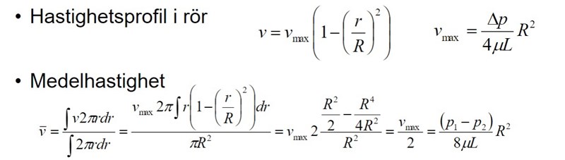 I den här härledningen visas att medelhastiheten för lamniär ströming i ett rör är hälften av den maximala hastigheten. Dock förstår jag inte vad om händer med nämnaren efter det andra likhetstecknet. Vi ser att 2rdr omskrivs till . Jag tolkar det därför som att 2rdr = .Hur kommer man fram till detta? Menar man att integralen av strömningstväsnittet av lilla r kommer motsvara strömingstväsnittet av den stora cylindern?