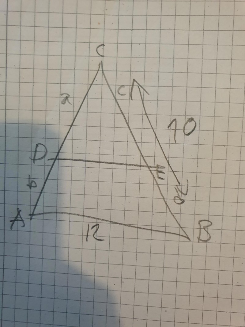 Jag fick den muntligt av min lärare. Först satte jag dit ABCDE sen abc och ska då få fram vad de små sidorna abc har för längd. Försökt med detta tal i 2 timmar och kommer inte längre än att skriva upp de med transversalsatsen vilket blir svårt att räkna ut då vi har för många okända siffror