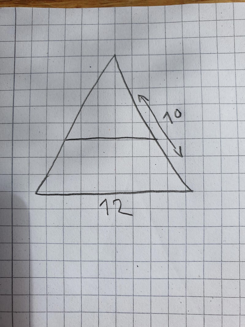 Det finns inte tillräckligt mycket information för att man skall kunna beräkna längden av transversalen, om man inte vet exempelvis att höjden i den lilla triangeln är hälften av höjden i den stora.