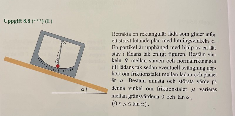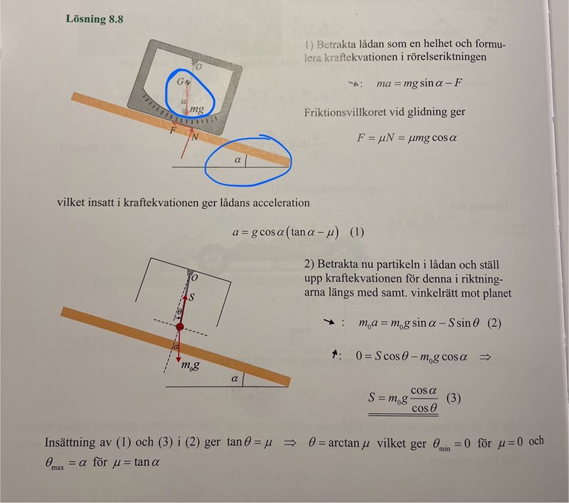 Jag har skickat en bild på uppgiften, och en annan bild på lösningen. I lösningen har de dragit ett streck ”mg” och skrivit in en vinkel a där, samma vinkel som finns mellan det lutande planet och marken. Hur kommer man fram till att denna vinkel vid mg är samma vinkel som mellan det lutande planet och marken? Jag misstänker att det handlar om transversalvinklar men förstår inte hur…