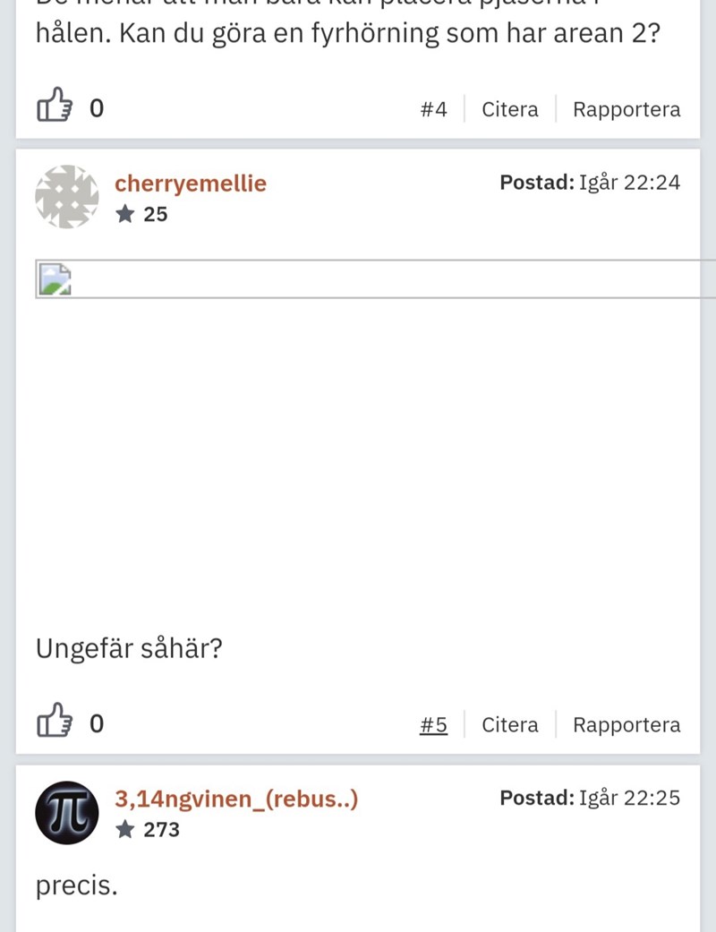 I det här inlägget https://www.pluggakuten.se/trad/geometri-887/?order=all#post-b6ca2f34-a162-45df-9c15-ae2c0160ece4 finns en bild, men för mig är det bara en liten trasig ikon. Det verkar som om någon har sett den riktiga bilden, men sedan har den gått sönder. Eller är det bara för mig som den är trasig?