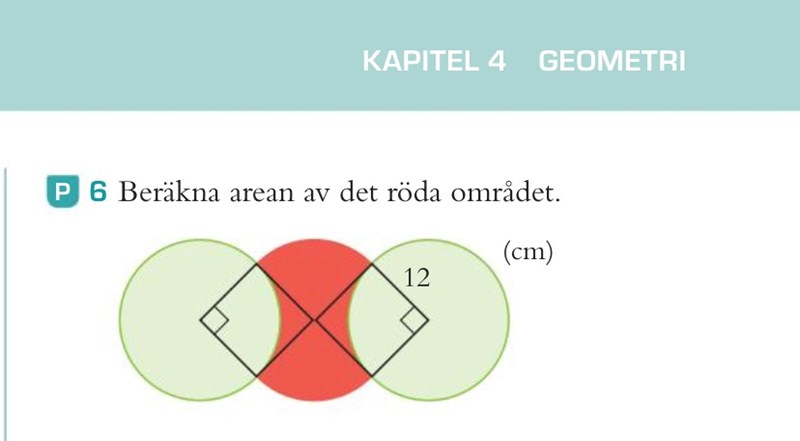Jag tänker att radien är 12cm så jag börjar först med att räkna ut arean av den röda cirkeln.