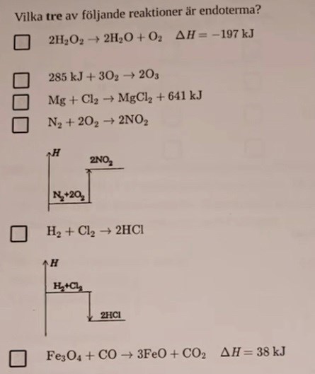 Okej, så jag ska kryssa i rutorna 3, 4 och 6 eftersom de är endoterma reaktionerna som upptar värmeenergi.