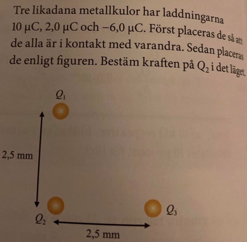Hej! Hur tänker jag här? Behöver hjälp! Men de första jag tänker på är att jag bör räkna kraften mellan Q2 och Q3 och sedan mellan Q2 och Q1 ? Eller är jag ute och cyklar.