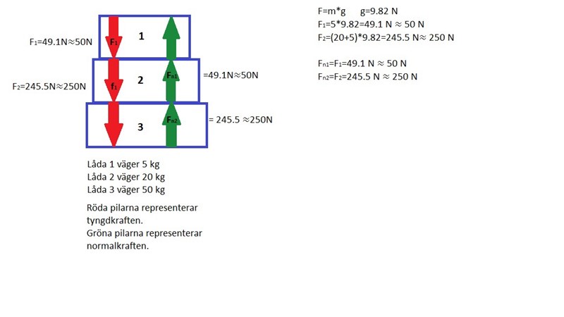 Fn1 är normalkraften som verkar mellan låda 1 och 2, Fn2 är normalkraften som verkar mellan låda 2 och 3.