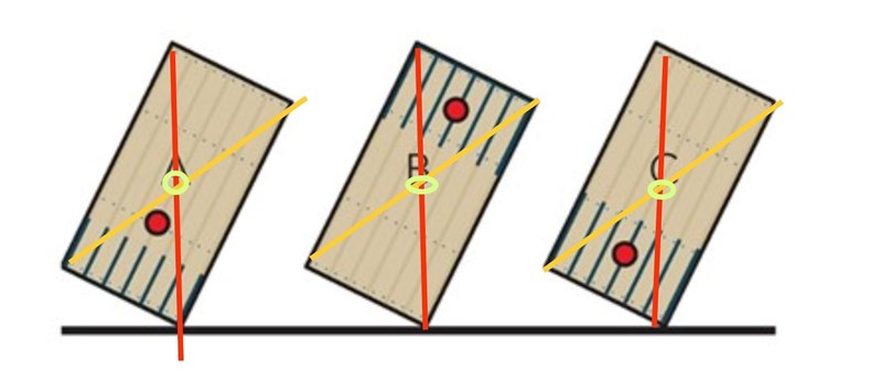 Det hade ungefär sett ut såhär (kanske slarvigt men gör bara det för förståelsen). Den röda linjen brukar kallas för lodlinje. Ser du att den tyngdpunkt de markerat på (a,c) ligger vänster om den "verkliga" tyngdpunkten? Och samma sak med (b) där den tyngdpunkten de skapat ligger höger om den "verkliga" tyngdpunkten?