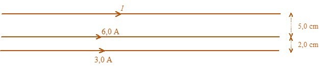 Figuren nedan visar tre långa parallella ledare. I två av dem är strömmen 6,0 A resp. 3,0 A. Avstånden mellan ledarna framgår av figuren. Hur stor skall strömmen I i den översta ledaren vara om kraftverkan på 6,0 A-ledaren skall vara noll?