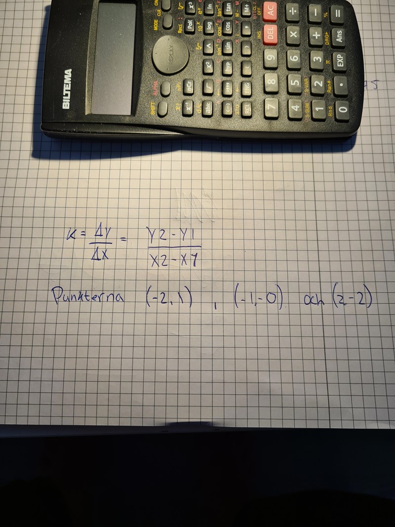 För den linjen som första och andra punkten ligger på, gäller alltså (y = kx + m):