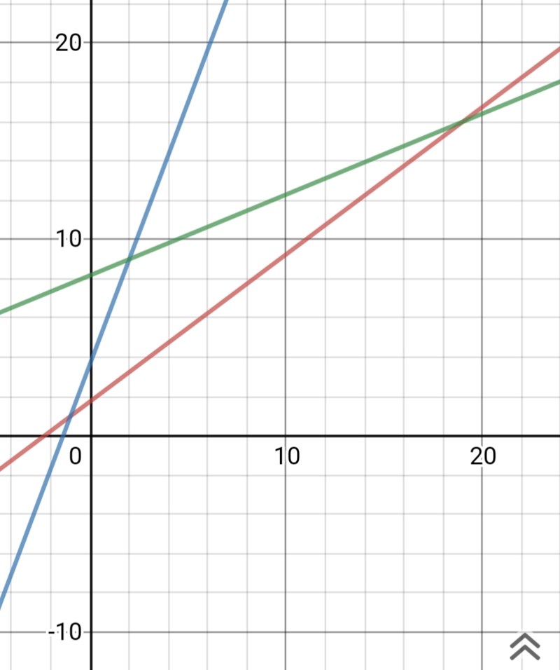 om jag sätter y1=y3 så får jag att deras skärningspunkt blir då x=19