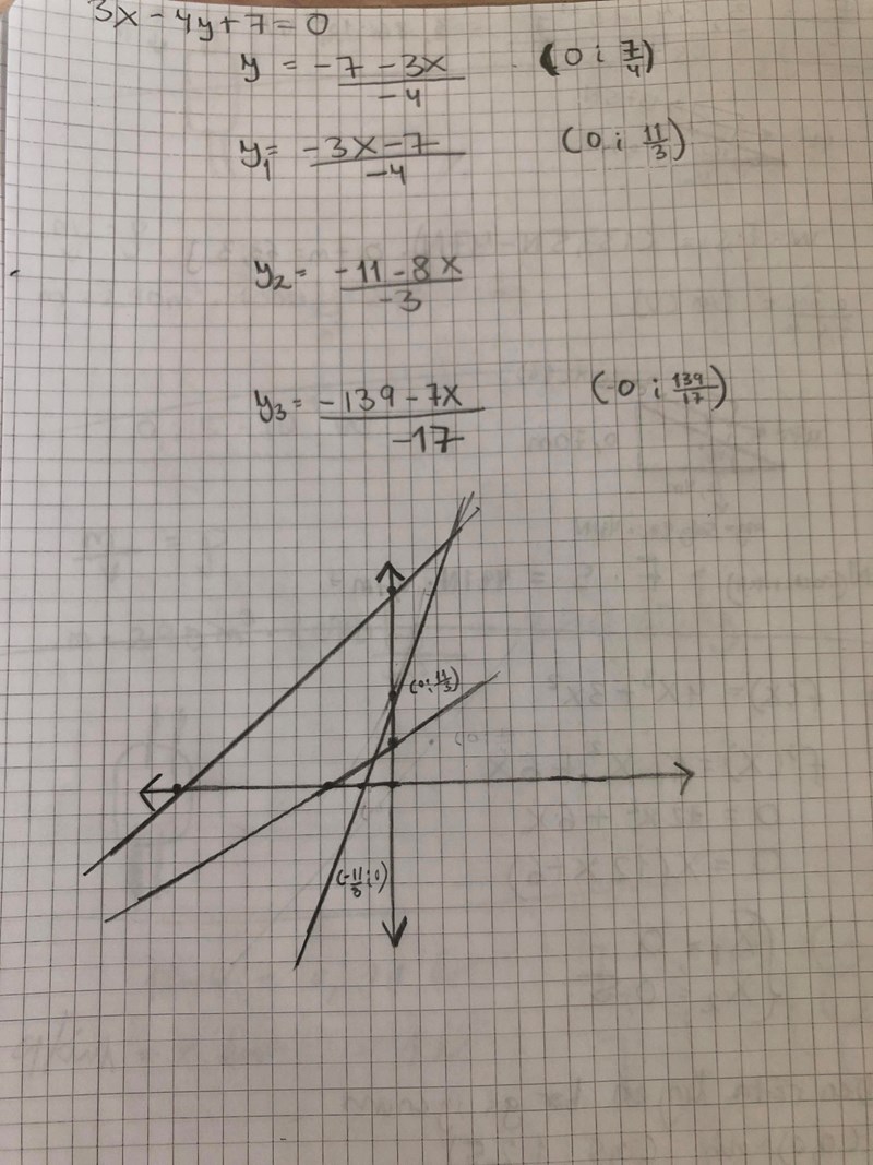 - Den skär x-axeln då y = 0, dvs då 3x - 4*0 + 7 = 0, dvs då x = -7/3. Markera punkten (-7/3, 0).