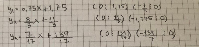 Jaså, du menar funktionerna för det tre räta linjerna. Lös de tre ekvationerna y1 = y2, y1 = y3 och y2 = y3 för att få fram de tre skärningspunkterna.