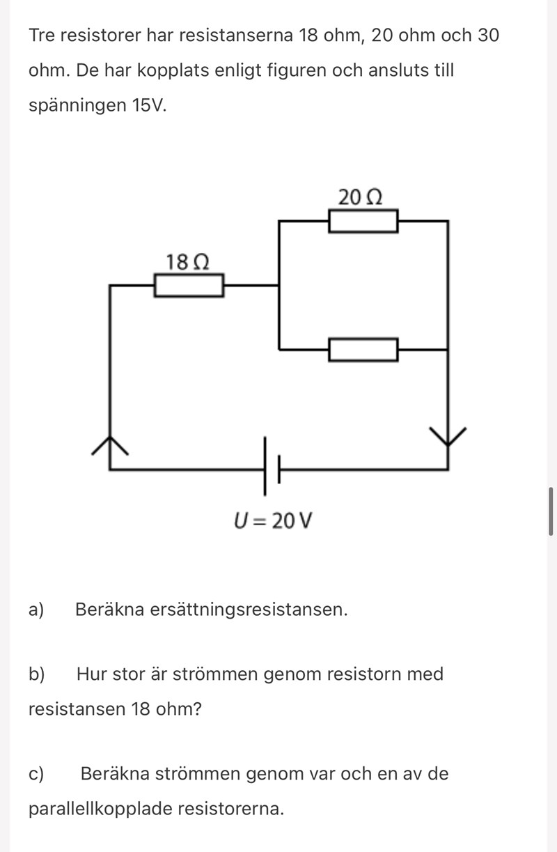 Tre resistorer har resistanserna 18 ohm, 20 ohm och 30 ohm. De har kopplats enligt figuren och anslutits sig till spänningen 15 V.