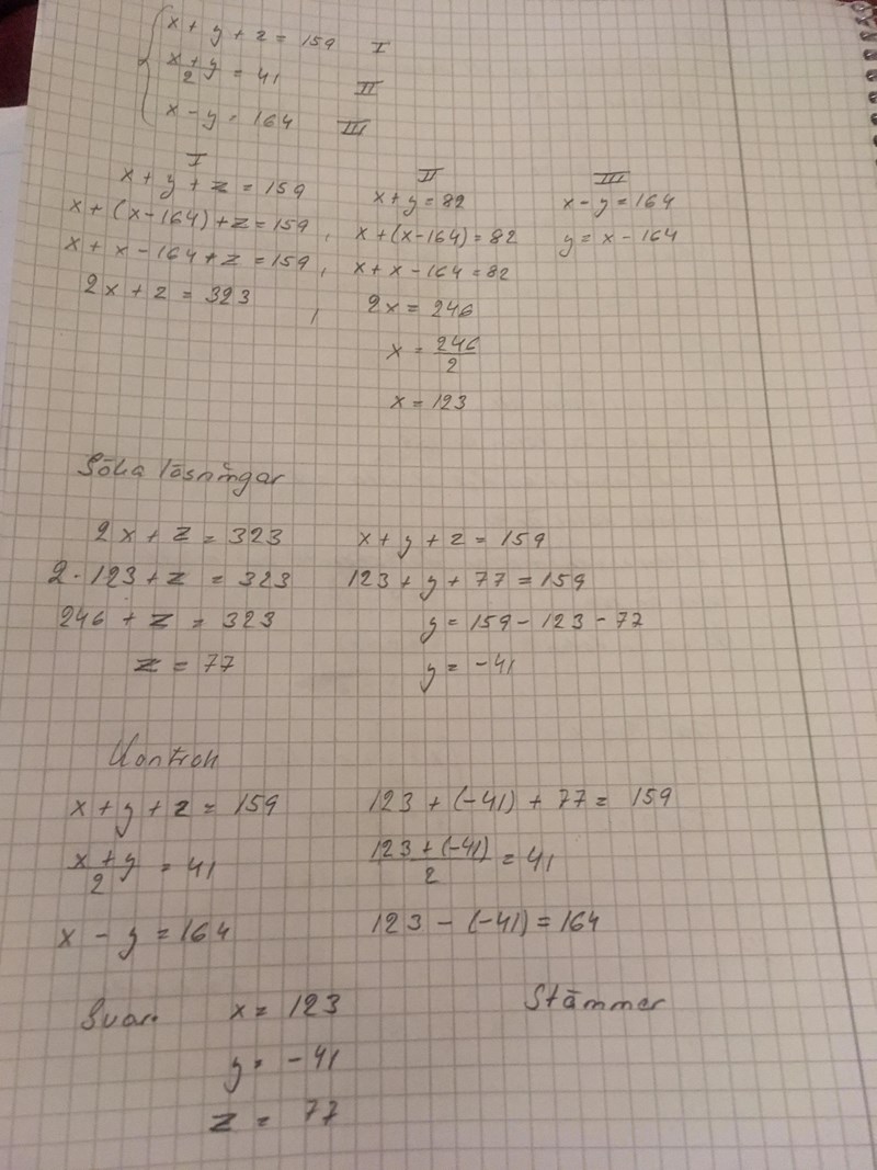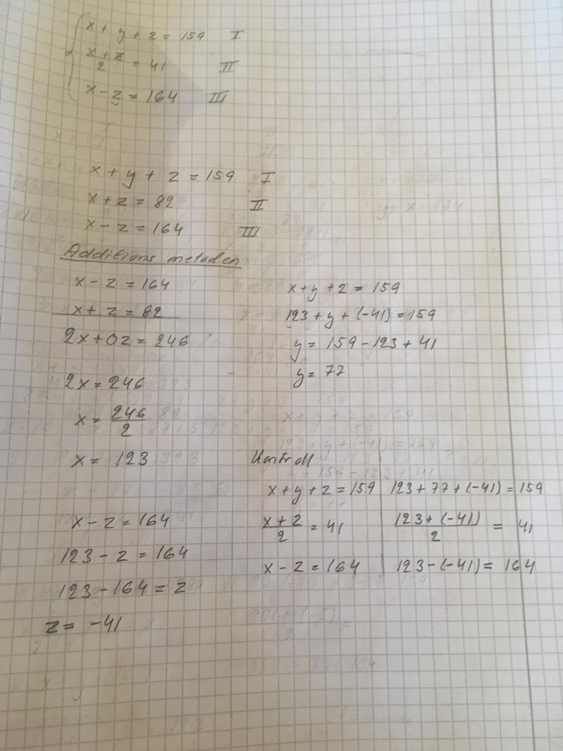 Här är ett exempel när jag (som brukar föredra substitutionsmetoden) skulle använda additionsmetoden. Dubbla ekvation 2 och därefter addera ihop den med ekvation 3. Det betyder inte att din metod är fel,men jag tror att beräkningarna skulle bli enklare på det här sättet (och det medför mindre risk för slarvfel).