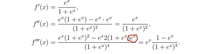sista ekvationen har jag använt kvotregeln för tredjederivatan, dock undrar jag vart de rödmarkerade kom ifrån?