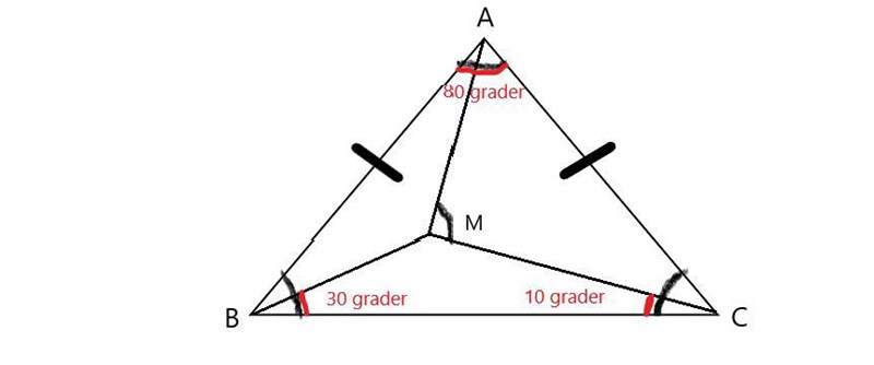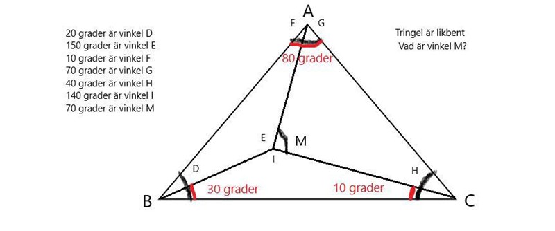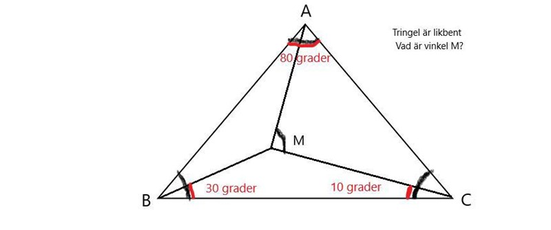 Det blir en himla massa likbenta trianglar överallt, som visar sig ha vinklar som redan är kända, och till slut får man ihop M.