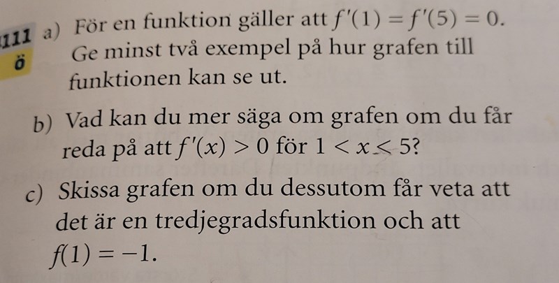 Jag behöver hjälp med c). Mha de andra deluppgifterna vet jag att f'1)=minimipunkt och f'(5) en maximipunkt.
