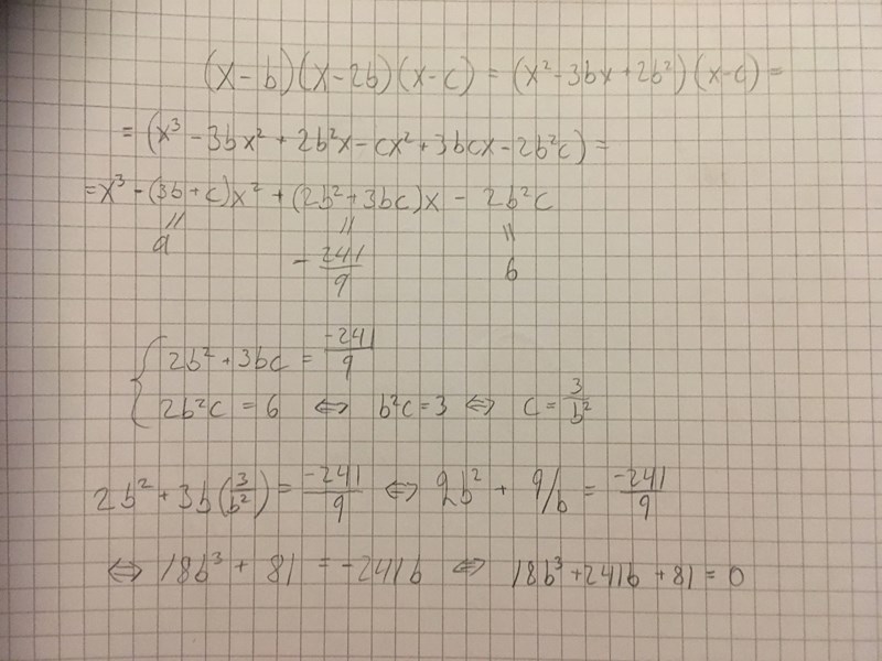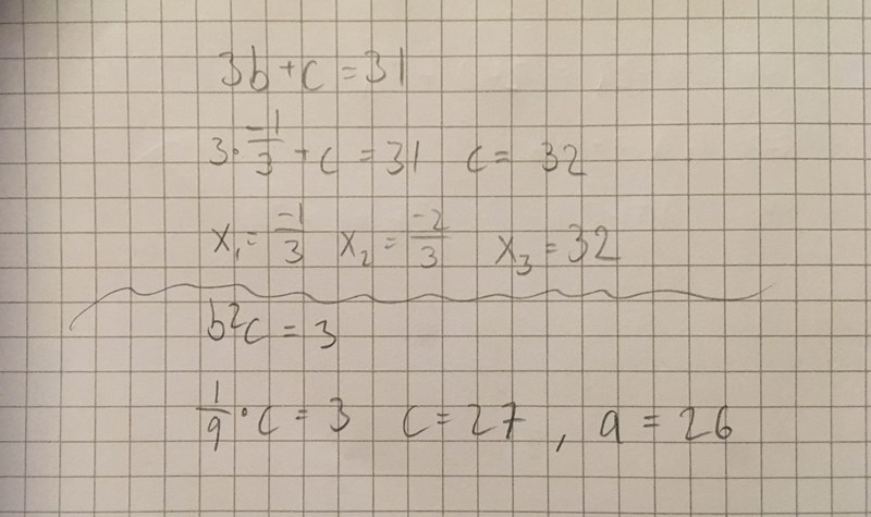 Allt jag ville med detta vara att försäkra sig om att ekvationen 18b3+241b+81=018b^3+241b+81=0 inte har några fler lösningar än b=-1/3b=-1/3. Detta kan man också göra med polynomdivision och konstatera att den andra faktorn inte ger några reella lösningar som Smaragdalena påpekar.